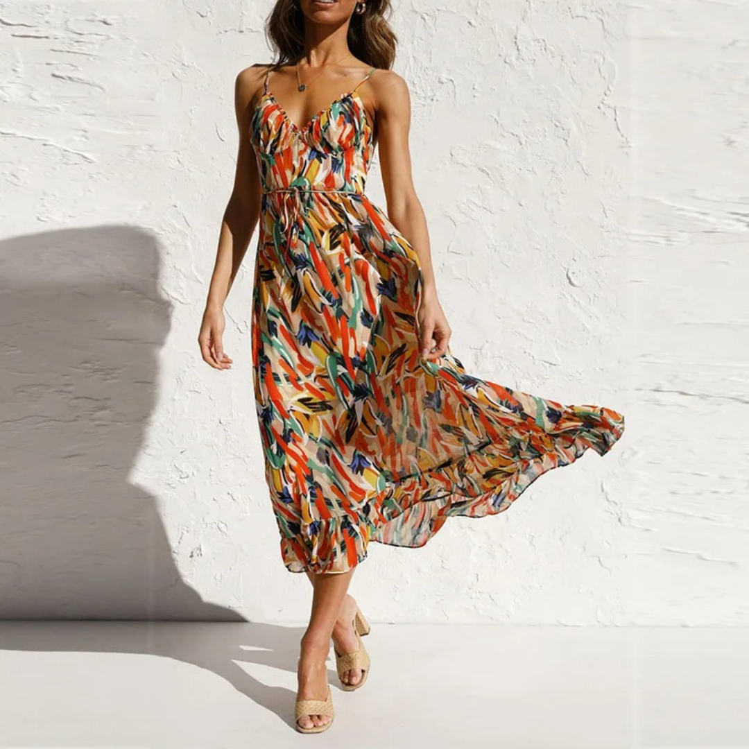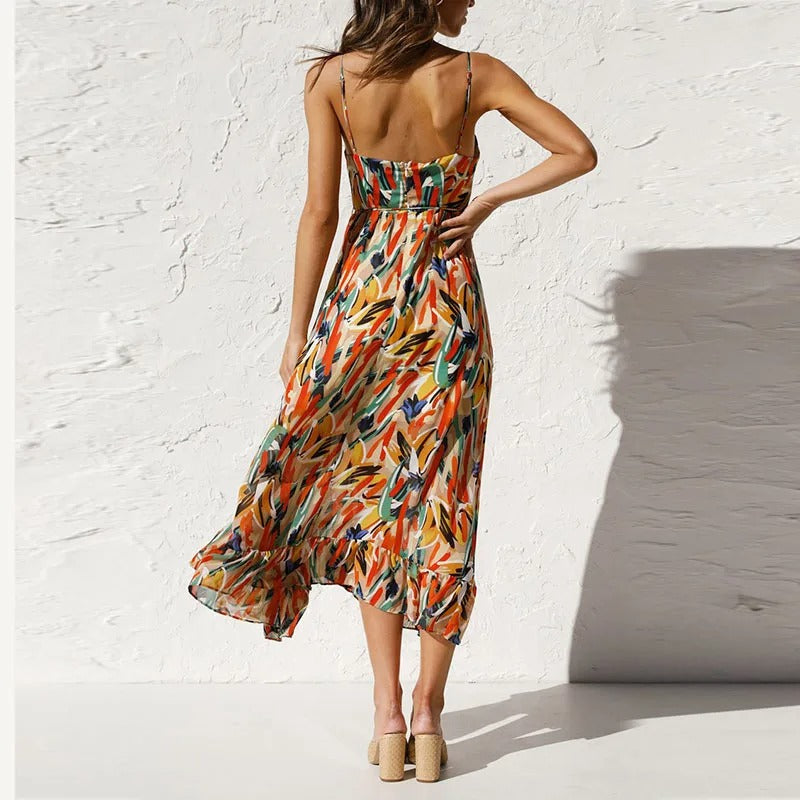 Découvrez la robe Pétale : une élégance bohème en version chic. Avec son motif floral abstrait et sa coupe cintrée, cette robe midi offre une silhouette féminine et gracieuse, parfaite pour se démarquer lors des vacances à la plage ou des escapades ensoleillées.